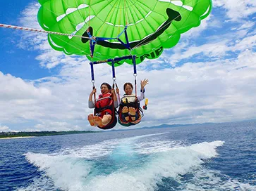 専用のパラシュートを装着して海上を空中散歩するインスタ映えのアクティビティです。ボートのスピードで上昇し、高度70〜80メートルまで浮上して景色を一望できるのが魅力。泳げなくてもライフジャケット着用で安心・手軽に楽しめ、子供からシニアまで参加いただけます。